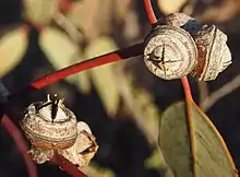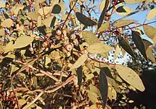 Finke River mallee was first formally described in 1920 by the botanist Joseph Maiden as Eucalyptus pachyphylla var. sessilis in his book A Critical Revision of the Genus Eucalyptus. The type specimen was collected by Ernest Giles in 1872 at Glen of Palms in the western Macdonnell Range, to the south of Hermannsburg[8][9] In 1934, William Blakely raised the subspecies to species status as E. sessilis in his book A Key to the Eucalypts.[10] A common name for this tree is the Finke River (or River) mallee.[4][3] The specific epithet (sessilis) refers to the sessile buds and fruit.[2]