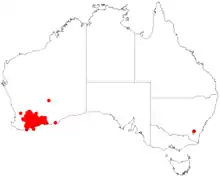 Burngup mallee grows on sand, loam, clay soils and gravel and is found on granite outcrops, lateritic hills and breakaways.[5][8] It is found between Peak Charles, Tarin Rock and the Fitzgerald River National Park in the Avon Wheatbelt, Coolgardie, Esperance Plains, Mallee and Murchison biogeographic regions.[4][5]