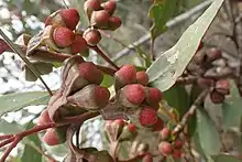 The adult leaves are disjunct, glossy, green, thick and concolorous. The blade is an elliptic or ovate shape that is basally tapered supported on quadrangular petioles. The simple axillary conflorescence has single flowered umbellasters on broadly flattened peduncles. Buds form that have an ovoid or pyriform shape with a calyx calyptrate that sheds early.[4]