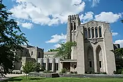 The other major non-residential structure in the Euclid Golf Allotment was St. Paul's Episcopal Church. St. Paul's had been the church of choice of the old Euclid Avenue aristocracy, but the decline of the avenue induced the church to move to Euclid Golf Allotment (where many of its parishioners had taken up residence). The church purchased several lots at the intersection of Coventry Road and Fairmount Boulevard (2747 Fairmount Blvd.), and hired architect J. Byers Hayes of the noted Cleveland architectural firm of Walker and Weeks to design the structure.[60] Construction began on the parish hall in 1927,[56] and services were first held there in April 1928.[60][61] The bell tower was finished in 1929.[62][61] The Great Depression halted additional construction for a decade.[61] Construction began on the sanctuary in 1941, but shortages of construction materials during World War II forced work to halt for several years.[63] Hayes revised his plans for the sanctuary in 1947 to reduce its cost, and construction began again in 1949.[61] The sanctuary was finished in 1951.[64]
