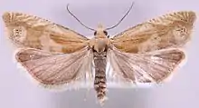 Eucosma hohenwartiana, the bright bell, is a species of moth of the family Tortricidae. It is found in China (Heilongjiang, jiangxi), Central Asia, North Africa[2] and Europe, where it has been recorded from Sardinia, Sicily, Ireland, Great Britain, Spain, France, Germany, the Benelux, Denmark, Austria, Switzerland, Italy, the Czech Republic, Slovakia, Slovenia, Hungary, Poland, Romania, Bosnia and Herzegovina, Norway, Sweden, Finland, the Baltic region and Russia.[3] The habitat consists of dry open areas and grassland.[4]