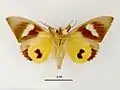 The wingspan is about 80–104 mm. Palpi with second joint very short and non-spatulate. Forewings with straight outer margin. Cilia non-crenulate. Head and collar plum fruit colored. Thorax greenish with tufts on metathorax. Abdomen orange. Forewings are golden greenish. A broad cream-colored costal fascia runs from near base of inner margin to apex, striated with pale red and turning to green at costa. There is a creamy marginal band as well. A curved red streak found below vein 2. Hindwings orange with large black lunule beyond lower angle of cell. A black marginal band with cilia whitish spots runs from costa to vein 2. Ventral side of forewings fuscous, with orange at base. Broad whitish postmedial band not reaching costa or inner margin. Cilia whitish.[3]
