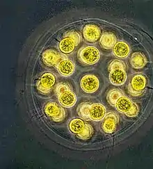 Eudorina is a paraphyletic genus in the volvocine green algae clade.[1] Eudorina colonies consist of 16, 32 or 64 individual cells grouped together. Each individual cell contains flagella which allow the colony to move as a whole when the individual cells beat their flagella together. Description by GM Smith (1920, p 95):[2]
