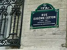 After her death, several primary schools in the Paris region were renamed after her, such as in Paris, Sèvres, Champigny-sur-Marne, Nanterre, Vitry-sur-Seine, Bonneuil-sur-Marne, or Rosny-sous-bois. There is also a Eugénie Cotton nursery school in Brétigny-sur-Orge, in Choisy-le-Roi, in Trappes and a school in Brittany, in Lanester, as well as in the Aube in Romilly-sur-Seine and in Moselle at Talange.[5][6]
