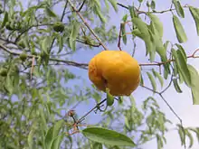 It blooms in early spring. Flowers are typical of myrtaceae; Appearing in the leaf axils, and are white, solitary with up to fifty stamens. About two months later it produces fruits, producing a globose and yellow color fruit, of up to 5 cm of diameter. It tastes similar to peach (Prunus persica) giving its vulgar name of peach tree. The fruit is edible, with the orange pulp, very juicy, slightly tart aftertaste when fully ripe.