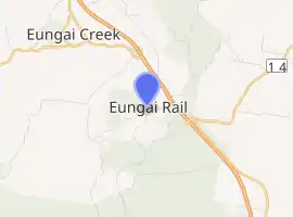 Eungai (postcode 2441) is a town on the mid-North Coast of New South Wales, Australia. It is made up of two localities, Eungai Creek[1] and Eungai Rail,[2] although both have the same postcode. The Eungai district is midway between Sydney (500 km) and Brisbane, midway between Port Macquarie (90 km) and Coffs Harbour, and midway between Kempsey (20 km) and Macksville. (see ) It is in the Nambucca Valley.