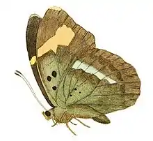 Under side: palpi and breast yellow. Anterior wings olive brown, tipped with white; but along the external edges of a hazel colour, and near the shoulders having three round black spots on each. Posterior wings similar to the anterior, being of a brown olive, variegated, and clouded, with three small spots placed near the shoulders, as in the superior ones. All the wings are a little dentated (tooth like). Wingspan a little over 3+1⁄2 inches (90 mm).[3]