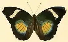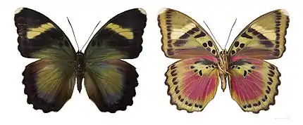 E. xypete. The apex of the forewing on both surfaces white for a breadth of 2-5 mm.; the submarginal spots of the under surface are more or less completely divided in two and placed only 2-4 mm. from the distal margin; the red costal stripe on the underside of the hindwing never entirely covers the base of cellule 7; the wings above with blackish ground-colour. -xypete Hew.. The under surface of the hindwing broadly suffused with red not only at the costal margin but also in the middle between veins 2 and 7; the subapical band of the fore wing is light yellow or whitish, edged with bluish, reaches vein 3 and is posteriorly not at all or but little widened; base and hindmargin of the forewing more or less extended blue-green; the hindwing shining blue-green above with broad blackish marginal band, in which the deep black submarginal spots often only stand out distinctly in certain lights. Under surface with sharply expressed black submarginal spots; forewing with three or four black spots in the cell and large black discal spots at the proximal side of the subapical band; hindwing only in the cell and at the base of cellules 4-6 (-7) light green with black spots, otherwise bright red, at the inner margin yellow and at the distal margin light green to yellowish green with black marginal line. Sierra Leone to Angola. - mirabilis Bartel [now species Euphaedra mirabilis] only differs in having the scarlet colour on the underside of the hindwing confined to the costal part and not reaching beyond vein 7; the middle of the hindwing beneath is yellowish green. Cameroons. - bombeana Strand is similar to the preceding form, but the subapical band is whitish, broader, and posteriorly more widened (6 mm., in cellule 4 nearly 10 mm. in breadth). Cameroons. - In crockeri Btlr. [now species Euphaedra crockeri ] the subapical band of the forewing is indistinct and not differing from the ground-colour; the hindwing beneath is only red at the costal margin, the red colour not extending posteriorly beyond vein 7; the ground-colour of the under surface is yellowish green, at the termen distally to the black submarginal spots dark brown. Ashanti and Niger. - crossei E. Sharpe ( = aureofasciata Lathy) [now species Euphaedra crossei ] differs from crockeri in having on the forewing a broad gold-yellow subapical band and a greenish hindmarginal spot, yellowish in the middle. Niger. - caerulescens [ now species Euphaedra caerulescens ] approaches the form crockeri but has the subapical band of the forewing light bluish, posteriorly widened and often reaching vein 2, the ground-colour of the under surface light bluish, and on the hindwing a narrow red costal stripe, usually not reaching vein 7. Congo. [3]