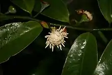 It has glossy, ovate to elliptic leaves, from 5 to 20 cm (2 to 8 in) long. The branches bear globose to urn-shaped fruits which are green in colour and measure 15–20 mm (0.6–0.8 in) in diameter. They yellow when ripe and contain pale-coloured, edible, jelly-like flesh inside, with many non-edible seeds (similar appearance to guava contents).[2][3][4] Germination from fresh seed commences after around three weeks and completes after five weeks, with a high rate of germination. Flowers are pollinated by small weevils, including Elleschodes hamiltoni and others in the same genus. Cuttings are not advised as a method of regeneration.[2]