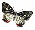 Female: Upperside: forewing similar, the white streaks much broader, single, not paired. Hindwing also similar, but the black on the terminal margin not at all or very slightly widened posteriorly, entirely without the crimson spots; there is instead a marked dilatation of the black bordering the veins 2, 3 and 4. Underside similar to the upperside.[3][4]