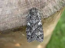 The wingspan is 50–60 mm. Forewing pale grey, more or less suffused with dark grey; a black streak from base below cell; stigmata large, grey, with black outlines, the cell dark: inner and outer lines filled in with whitish; submarginal line formed of large black and white teeth; hindwing fuscous, the fringe white. This fine species occurs - The form implicata is nearly black, a mountain form, found in Finland, on the Harz Mts. in Germany, and in Scotland. — ab. extricata Zett. from Lapland is an intermediate form.[1]