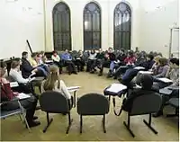 Today, EUSP maintains a good relationship with different levels of government and administration, as evidenced among other things by a visit and meeting of the Russian Minister for Education and Science Andrei Fursenko[15] with the faculty and students at EUSP on 4 June 2009 and by the address by deputy governor of Saint Petersburg Mikhail Oseevsky[16][17] at the opening of the academic year ceremony on 7 September 2009. At a similar ceremony on 5 September 2011 the faculty and students of EUSP were greeted by the deputy chairman of the Saint Petersburg Committee for Science and Higher School Alexander Matveev.