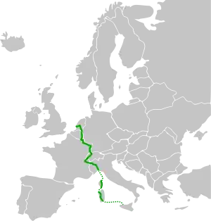 It passes through the following cities: Hook of Holland – Rotterdam – Utrecht - Eindhoven – Maastricht – Liège – Bastogne – Arlon – Luxembourg City – Metz – Saint-Avold – Strasbourg – Mulhouse – Basel – Olten – Bern – Lausanne – Geneva – Mont Blanc Tunnel – Aosta – Ivrea – Vercelli – Alessandria – Genoa ... Bastia – Porto-Vecchio – Bonifacio ... Porto Torres – Sassari – Cagliari ... Palermo.[1]