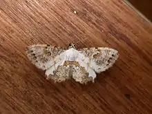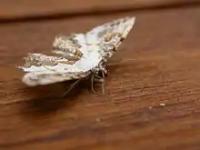 Adults have a complex wing pattern consisting of shades of brown. There is a ragged white inner margin on each forewing and along the costa of each hindwing.[5]