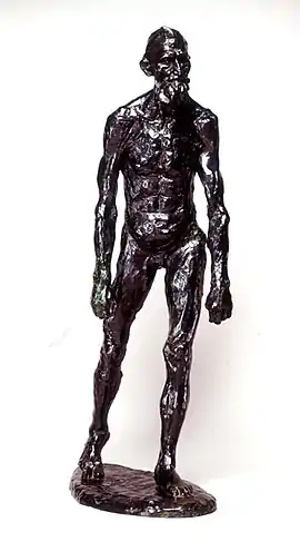 Rodin also produced nude models of the individual figures - this work is one of them.[4] He also made head and hand studies. For the figure of Saint Pierre, the head model was the painter Jean-Charles Cazin, who came from the Pas de Calais - 19th century pseudo-sciences such as physiognomy held that each region had a specific set of facial features.[5] Although clothed in a robe and with a noose round his neck, the figure of Saint Pierre in the finished group is otherwise almost identical to the model.
