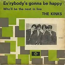 "Ev'rybody's Gonna Be Happy" is a song by Ray Davies, released as a UK single by the Kinks in 1965. As the follow-up to the number-one hit "Tired of Waiting for You", and having their previous three singles all chart among the top two, it was less successful, reaching number 17.[1] It broke a run of what would have been thirteen consecutive top-ten singles in the UK.