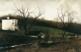 The pond to the right in the picture features in several of Wyeth's paintings. Karl Kuerner, the owner of the Kuerner Farm, got the idea to build it after his children built a small pond to play with at the same location. The pond was used to farm fish and to cut ice from in the winter. The ice was put in a nearby icehouse which worked as a refrigerator. Wyeth was fascinated by the overflow which sometimes occurred, and depicted this in several paintings, such as Dam Breast from 1970 as well as Evening at Kuerners from the same year.[1]