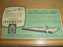 In 1962, Hammond Organ Company acquired Everett Piano Company to enter the piano industry. Then in 1973, Yamaha bought Everett Piano Company, and manufactured both Yamaha and Everett pianos in South Haven.[2] When Yamaha moved its piano production to a plant in Thomaston, Georgia in 1986, Everett pianos were continued to be manufactured in South Haven by Baldwin Piano and Organ Company, by the contract with Yamaha. However, this contract was subsequently discontinued, and the company finally came to an end in 1989.[4]