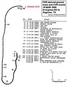 Flight 17 began its takeoff roll from runway 17 at 02:09:13 and lifted off at 02:09:46. At 02:09:49, three seconds after rotation, the main cargo door partially opened, which was indicated by the CVR recording a sudden increase in background noise. The ground proximity warning system (GPWS) activated, sounding "whoop whoop terrain" four times. First officer Johnston declared an emergency to air traffic control (ATC). The controller asked the crew the nature of the emergency, and first officer Johnston replied, "okay we got a cargo door open." After ATC asked Flight 17 to report on when they were on the downward leg of their emergency final approach, the flight crew developed problems with communication. The flight climbed to 2,500 feet (760 m) and then began a right turn back towards Carswell. During the downwind leg, the main cargo door completely opened, causing the aircraft to yaw and roll uncontrollably. The aircraft then banked to the left, inverted, and crashed into a pasture near Saginaw. The aircraft exploded on impact, killing the crew.[3][9]