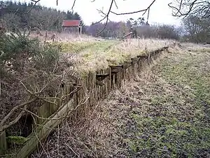 One of the original stations on the branch line Ewesley was constructed in the centre of a circular prehistoric camp.[3] Later in 1894 the only passing loop on the otherwise single track line was constructed at Ewesley. At closure the station had been renamed Ewesley Halt. Although in a bad state of repair the platform remains intact, the station building has been demolished.