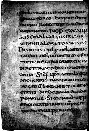 The Excarpsus Cummeani, also called the Pseudo-Cummeani,[1] is an eighth-century penitential, probably written in the north of the Frankish Empire in Corbie Abbey.[2][3] Twenty-six copies of the manuscript survive; six of those were copied before 800 CE.[1] It is possible that the penitential, which extends its scope beyond monasticism to include clerics and lay people, has a connection to Saint Boniface and his efforts to reform the Frankish church in the first half of the eighth century. Geographic spread by the end of the eighth century and continued copying of the manuscript into the 9th and 10th centuries have been interpreted to mean the work was considered "by the Christian authorities" a canonical text.[1] It was used as late as the eleventh century, "as the main source of the P. Parisiense compositum".[4]