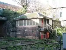 In the 1860s there was just a single track to the East but two tracks to the West; all the points and signals were operated on the ground. The first signal boxes were brought into use in 1875 when three controlled the extensive layout: 'Queen Street A' and 'Queen Street B' at the east end of the station, with 'Queen Street C' situated at the west end between the two platforms. These signal boxes were all closed in the 1920s. The C box was replaced by a new one at the west end of the eastbound platform on 13 September 1925. The A and B boxes were replaced by a new, larger box on the north side of the line beyond the New North Road bridge on 15 November 1927. This was named 'Queen Street A' and the C box was renamed 'Queen Street B'; six years later they were renamed again as 'Exeter Central A' and 'Exeter Central B'.[1]