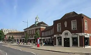 The original station had just a single platform with two tracks which were covered by a large train shed. A second platform and train shed was added in 1874 and two sidings were laid to give a total of four tracks between the platforms. The LSWR became a part of the Southern Railway (SR) in 1923 and two years later the eastbound platform was lengthened from 600 feet (180 m) to 1,210 feet (370 m), taking it beyond the New North Road bridge at the east end of the station. A fire damaged the original wooden buildings on the westbound platform in 1927 and work on rebuilding the station started in 1931. The train sheds were demolished and new brick buildings were officially opened on 1 July 1933 when the station was renamed Exeter Central. At this time there were four platform tracks – east-facing terminal platforms 1 and 4 and through platforms 2 and 3 – and two additional through lines in the centre of the station.[3]