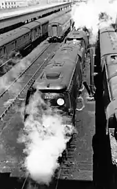 The three-track locomotive shed was sited to the east of the station on the south side of the line. The original 170-foot (52 m) shed was extended to 234 feet (71 m) in 1872 and further modernised facilities were brought into use five years later. Despite these alterations the space was too small to handle all the locomotives working in and out of the station so a new maintenance depot was opened at Exmouth Junction in 1887. A few sidings and the turntable was retained at Queen Street. This turntable was 42 feet (13 m) long but in 1888 it was replaced by a 50 feet (15 m) example.[1]