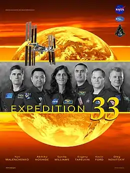 ![]() Expedition 33 mission patch ![]() (l-r) Williams, Malenchenko, Hoshide, Tarelkin, Novitskiy and Ford | |