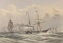 A final set of cruises occurred in April to July 1846 starting at Cobh under Commodore Sir Francis Collier in the Napoleonic-era HMS St Vincent, with a "squadron of evolution" made up of sailing ships of the line and steam-ships, including: HMS Trafalgar, HMS Queen, HMS Rodney, HMS Albion, HMS Superb, HMS Raleigh, HMS Vanguard, HMS Belleisle, and HMS Brilliant. Paddle steamers: HMS Retribution, HMS Gladiator, HMS Scourge, HMS Devastation, HMS Cyclops, and HMS Rattler (the Navy's first screw propeller ship.[6]