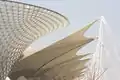 The Expo Axis is covered by a membrane roof with a total surface of 65,000 m2, currently the largest of its kind in the world. The roof is carried by 19 interior and 31 exterior masts and by six funnel shaped framework shells consisting of steel and glass. It has a height of 45 m and a free projection of 80 m. These so-called Sun Valleys direct natural LED light below.