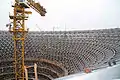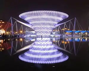The combination of the membrane structure, which has a surface of 65,000 m2 in total with a span of 100 m, and the six steelglass funnels of 45 m height, formed of a freeform double-curved framework, constitutes the landmark of the Expo Shanghai 2010.[1]