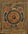 At the heart of the composition of such icons is the recurring motif of circles. In the central circle, Jesus Christ is depicted in the iconographic image of the Saviour Emmanuel with a blessing gesture. From this circle on the diagonal proceed 4 rays, on their tops are 4 small circles, inside of which are the allegorical symbols of the evangelists (see tetramorph), or less often, the images of the four evangelists themselves.