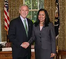 ![]() Ambassador Veiga with President Bush after presenting her credentials as ambassador, August 16, 2007 | |