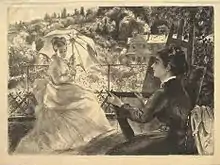 In 1874 Bracquemond participated in the first exhibition of impressionist painters in the workshops of Nadar, Boulevard des Capucines, of artists that would be called the Impressionists.[6] The inauguration took place on 15 April 1874 and enjoyed a scandalous success. He presented a portrait, a frame of etchings including the portraits of Auguste Comte, Charles Baudelaire and Théophile Gautier, but also etchings after Turner, Ingres, Manet, and original etchings: Les Saules (The Willows), Le Mur (The Wall). He exhibited again with his friends in 1879.[2]