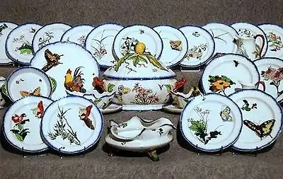 The service was then completed (tea cups, coffee, etc.) and the manufacture left to the Creil and Montereau factory. Barluet, Lebeuf's successor, re-edited it in the early 1880s. In 1885, Eugène Rousseau sold his business to Ernest-Baptiste Leveillé, who continued to publish the service under his own brand. Many reissues or variants followed. Among them, that of the Manufacture Jules Vieillard in Bordeaux (late 19th century), that of the Crystal Stairs (early 20th century), or even of the faience of Gien The large birds still in reissue. It can also be noted that many pieces of this service are now preserved in various French national museums (Musée d'Orsay, Musée national Adrien Dubouché, etc.).[10]
