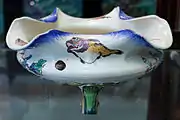 Eugène Rousseau was convinced and ordered two hundred pieces to be manufactured in Creil-Montereau faience. Bracquemond made the etchings and the engraved planks used by the manufacture. The proofs were cut and put on the clay to receive the decoration. In the oven, the heat made the paper disappear, leaving only the imprint of the drawing. Then it was painted over and the piece was placed in the large oven.