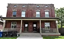 The F.E. Haley Double House, also known as the Gordon Apartments, is a historic building located in Des Moines, Iowa, United States. This double house is significant as being one of the first of this kind of building type built in the Des Moines area.[2] The double house was developed in this area starting in the Victorian era. This 2½-story, brick Colonial Revival was built in 1897 by Felix E. Haley. He managed the building, but never lived here, suggesting he had it built for rental/investment purposes. The building features a symmetrical facade, brick in several colors and textures, and a sloping flat roof. While it originally had a full-length front porch, this one is not the original.[2] The four lunette-shaped windows in the frieze feature shield-shaped panes. The house was listed on the National Register of Historic Places in 1998.[1]