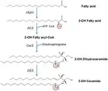- Uchida Y, Hama H, Alderson NL, Douangpanya S, Wang Y, Crumrine DA, Elias PM, Holleran WM (May 2007). "Fatty acid 2-hydroxylase, encoded by FA2H, accounts for differentiation-associated increase in 2-OH ceramides during keratinocyte differentiation". The Journal of Biological Chemistry. 282 (18): 13211–9. doi:10.1074/jbc.M611562200. PMID 17355976.
