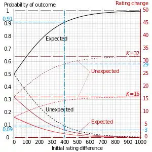 Few video games use the original Elo rating system. According to Lichess, an online chess server, the Elo system is outdated, with Glicko-2 now being used by many chess organizations.[63] PlayerUnknown’s Battlegrounds is one of the few video games that utilizes the very first Elo system. In Guild Wars, Elo ratings are used to record guild rating gained and lost through guild-versus-guild battles. In 1998,[64] an online gaming ladder called Clanbase[65] was launched, which used the Elo scoring system to rank teams. The initial K-value was 30, but was changed to 5 in January 2007, then changed to 15 in July 2009.[66] The site later went offline in 2013.[67] A similar alternative site was launched in 2016 under the name Scrimbase,[68] which also used the Elo scoring system for ranking teams. Since 2005, Golden Tee Live has rated players based on the Elo system. New players start at 2100, with top players rating over 3000.[69]