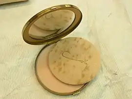 Pressed powder is available in different shades and is sold in a compound container. It is compressed to provide a travel-friendly product for on-the-go touch-ups.[46] Pressed powders give coverage to the face, concealing blemishes and discolouration, therefore can be used as a light coverage foundation.[47] The particles in pressed powder are larger than those in loose powder and can give off a thick, clotted appearance when overused.[45] Pressed powder can also be used for setting makeup.