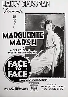 Face to Face is a 1922 American silent mystery film directed by Harry Grossman and starring Marguerite Marsh, Edna Holman and Coit Albertson.[1] [2] It was distributed by the independent company Playgoers Pictures.