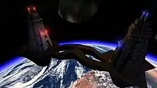 As a result of Facing World's polygon budget being exhausted on its dual towers, a traditional landscape was omitted in favor of having the map take place in space, with Fiorentino employing an animated skybox to give the impression that the map is "in a chaotic orbit above the Earth."[1]