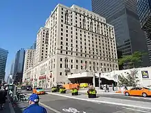 Along with traditional features found on most Chateauesque-styled hotel, the building also incorporated an Art Deco setback and Romanesque-inspired decor.[6] The balanced design of the building (prior to the addition of the east wing) was achieved through the application of semi-neoclassical motifs, and groups of arcaded windows.[9] The interior of the building was largely created in an Edwardian architectural style.[6] Its interior features a number of crystal chandeliers, and a hand-carved wood lobby ceiling.[10]
