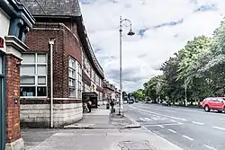 Annadale House was located in an estate that now comprises Melrose Avenue, Lomond Avenue, Waverly Avenue, and Inverness Road.[22] Cadogan and Addison Roads were built in the mid-1800s, and were named for Dublin peers.[23] A number of Georgian houses have since be demolished including Mulberry Lodge, Pennyville,[8] and Woodlands.[24] A Carmelite monastery once stood on Fairview Avenue, on the site of Fairview cinema.[8] Pennyville was a small estate at the end of Fairview Avenue which was later known as Croydon Park.[25] Bushfield House has survived, and stands on Philipsburgh Avenue. It was previously known as Cutaldo and dates from circa 1790.[26] From the 1840s, houses were built on Richmond Avenue, which was seen as a fashionable area. The area which is now Merville Avenue was known as the Big Gun after a local tavern. When Fairview Church was opened in 1855 there were 20 houses on Fairview Strand, two on Windsor Avenue, and 41 houses on Philipsburgh Avenue.[24] The horse trams and later the railway trams which crossed over Anneseley Bridge and ran up to Clontarf increased the accessibility of Fairview.[23]