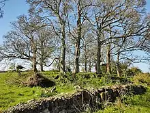 Fairy forts (also known as lios or raths from the Irish, referring to an earthen mound) are the remains of stone circles, ringforts, hillforts, or other circular prehistoric dwellings in Ireland.[1] From (possibly) the late Iron Age to early Christian times, the island's occupants built circular structures with earth banks or ditches. These were sometimes topped with wooden palisades and wooden framed buildings. As the dwellings were not durable, in many cases only vague circular marks remain in the landscape.[2] The remains of these structures, in conjunction with the vegetation around them,[3] are associated with local traditions and folklore, perhaps involving fairies or other supposed supernatural entities, who would "defend" the structures from destruction by builders or farmers.[4]
