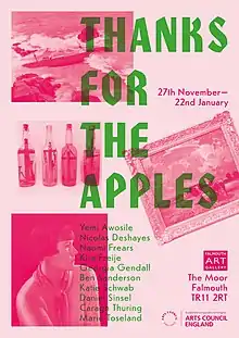 In November 2021 to January 2022, the gallery hosted a collaborative group exhibition titled 'Thanks for the Apples', which featured nationally and internationally recognised contemporary artists including Nicholas Deshayes and Caragh Thuring. The show was devised and produced by Naomi Frears and Ben Sanderson, who invited artists on a trip to Cornwall to visit the county's museums and explore their collections and archives.
