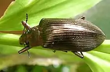 These beetles are 2.5 to 3.5 cm long and are usually metallic and shiny in appearance with elongated sub-parallel-sided elytra. The tip of the clypeus is extend forward on the sides. The antennae are not long enough to reach the humerus and have the four terminal segments flattened. The elytra are often grooved with puncturing and the humeral region appear swollen.[1]