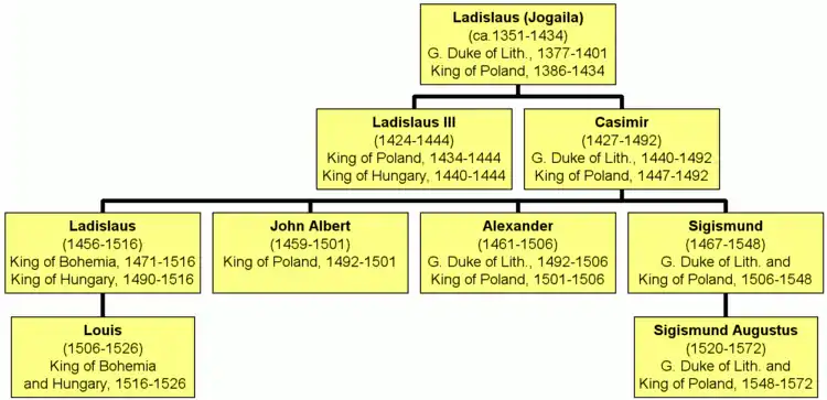 The Jagiellon dynasty started with Jogaila and had four generations of rulers, who ruled in several European countries: