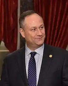 Douglas Emhoff is the husband of Kamala Harris. He was born to Jewish parents,[1] Michael and Barbara Emhoff, in Brooklyn, New York. He lived in New Jersey from 1969 to 1981, moving with his family to California when he was 17.[2][3][4] Emhoff graduated from the California State University, Northridge and USC Gould School of Law.[5] Emhoff is an entertainment litigator and began his career at Pillsbury Winthrop's litigation group. He later moved to Belin Rawlings & Badal, a boutique firm, in the late 1990s. He opened his own firm with Ben Whitwell in 2000. The firm was acquired by Venable in 2006. Emhoff is now employed by DLA Piper, working at its Washington, D.C., and California offices.[6] Emhoff was married for 16 years to film producer Kerstin Emhoff née Mackin. They have two children.[7][4] He married Harris on August 22, 2014, in Santa Barbara, California, with Harris's sister Maya Harris officiating.[8]